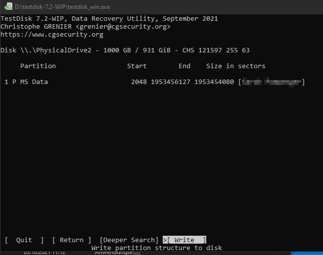 Die Analyse geht in der Regel sehr schnell und werden die Partitionen richtig gefunden, können diese mittels „Write“ gespeichert werden. Wichtig hierbei: Die Größe der Festplatte muss richtig angezeigt werden, ansonsten wird die Wiederherstellung nicht erfolgreich sein. Diese Variante kann die Festplatte sehr schnell wieder funktionstüchtig machen.