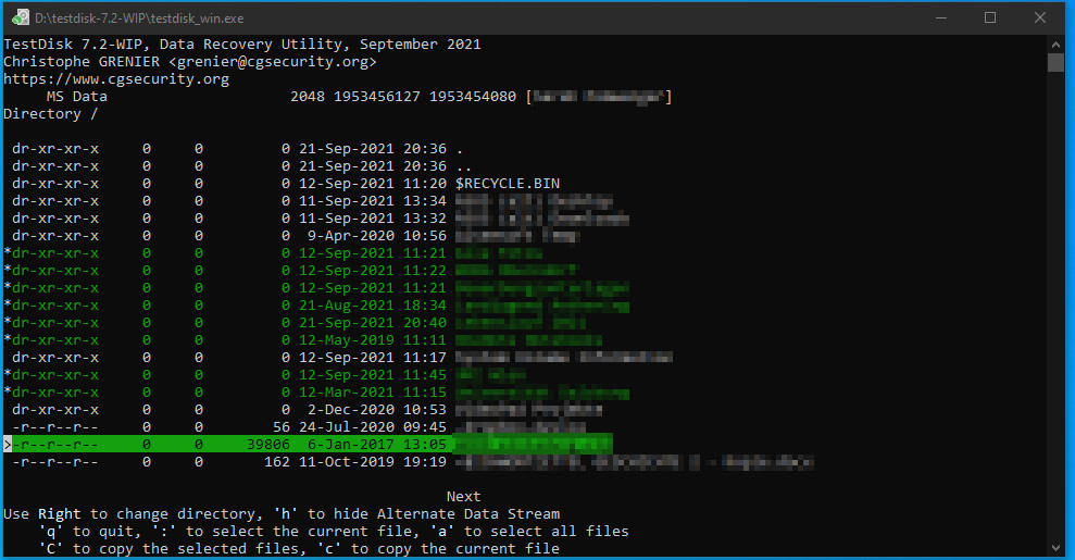 Sollte das Schreiben der Partition die Festplatte nicht reparieren können, gibt es immer noch die Möglichkeit direkt auf einzelne Ordner oder Dateien mit „P: list files“ zuzugreifen und diese zu kopieren.