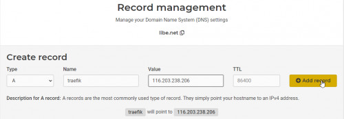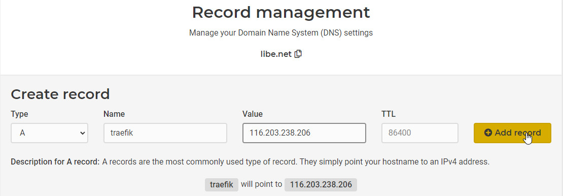 Anstelle von traefik.domain.tld kann für den Zugriff auf das Dashboard eine Subdomain einer vorhandenen Domain verwendet werden. Als Beispiel könnte in der DNS-Zonenverwaltung für die Domäne libe.net ein A-Record für eine Subdomain traefik.libe.net auf die IP-Adresse des Webservers erstellt werden.