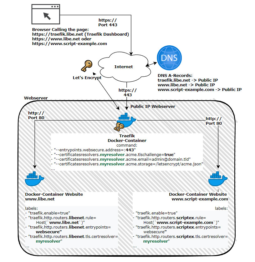 Der Traefik-Docker-Container kümmert sich um das Ausstellen, Verwalten und Verwenden von SSL-Zertifikaten und leitet Webanfragen auf die jeweiligen Webservices, die wiederum auch als Docker-Container bereitgestellt werden.