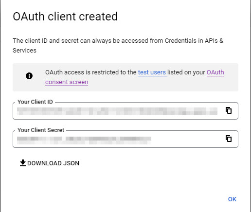 Nach dem Erstellen des oAuth-Clients wird die Client-ID und das Client Secret ausgegeben: