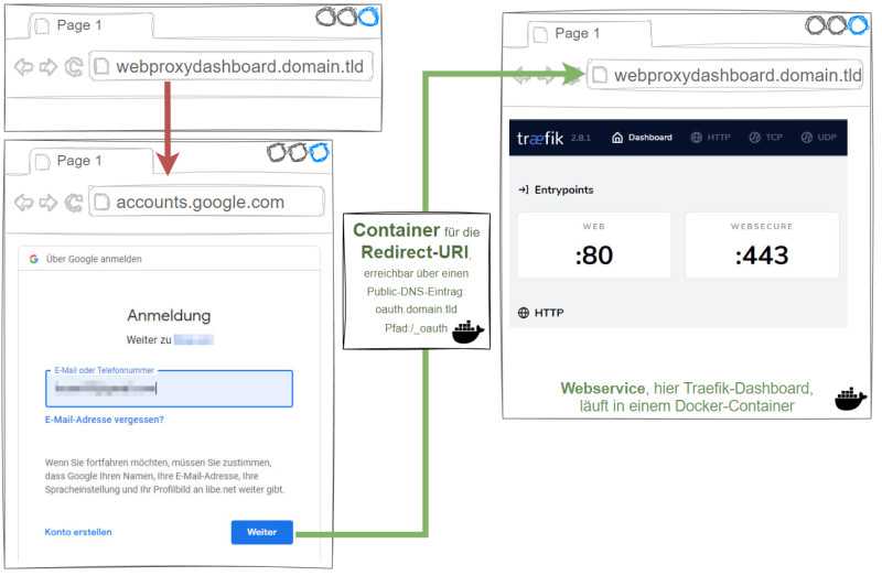 Die Sicherheit eines Webservice ist wesentlich von dessen Benutzeranmeldung abhängig. Sollte ein Webservice keine eigene Benutzeranmeldung besitzen, kann beim Einsatz des Traefik-Reverse Proxy einfach eine Anmeldung vorgeschaltet werden. Der Zugriff auf das eigentliche Webservice wird damit erst erlaubt, wenn die Anmeldung am Reverse Proxy erfolgreich war. Die einfachste Variante für eine vorgeschaltete Anmeldung ist eine Basic-Authentifizierung. Etwas aufwändiger, aber möglicherweise komfortabler und zudem meist noch sicherer ist die Verwendung von OAuth. OAuth ermöglicht das Anmelden über einen zusätzlichen Anmeldeanbieter: Identity-Provider, kurz IDP. Einmal am IDP angemeldet, können alle Services aufgerufen werden, die den IDP verwenden. Wer als Beispiel den IDP von Google für die OAuth-Anmeldung verwendet, kann nach einer einmaligen Anmeldung mit dem Google-Konto die Anmeldeinformationen auch für die eigenen Webservices nutzen.