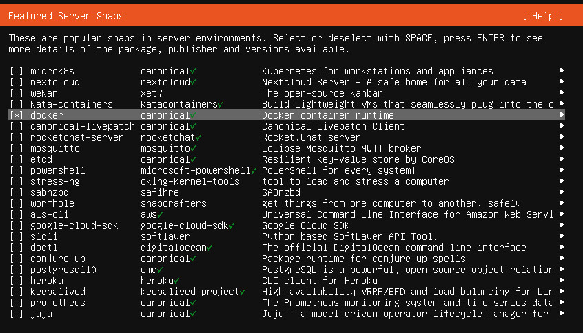 Docker kann während der Serverinstallation einfach als "Featured Server Snap" aktiviert werden.