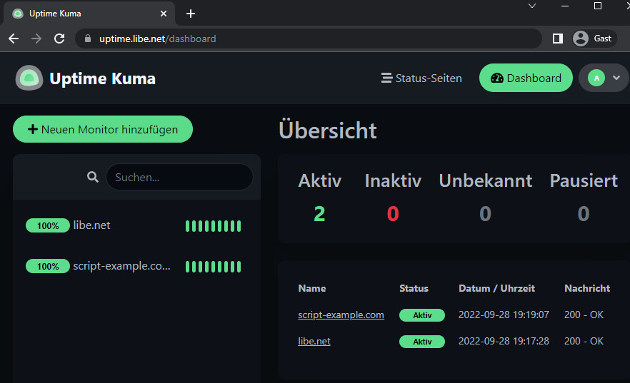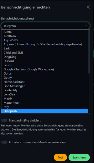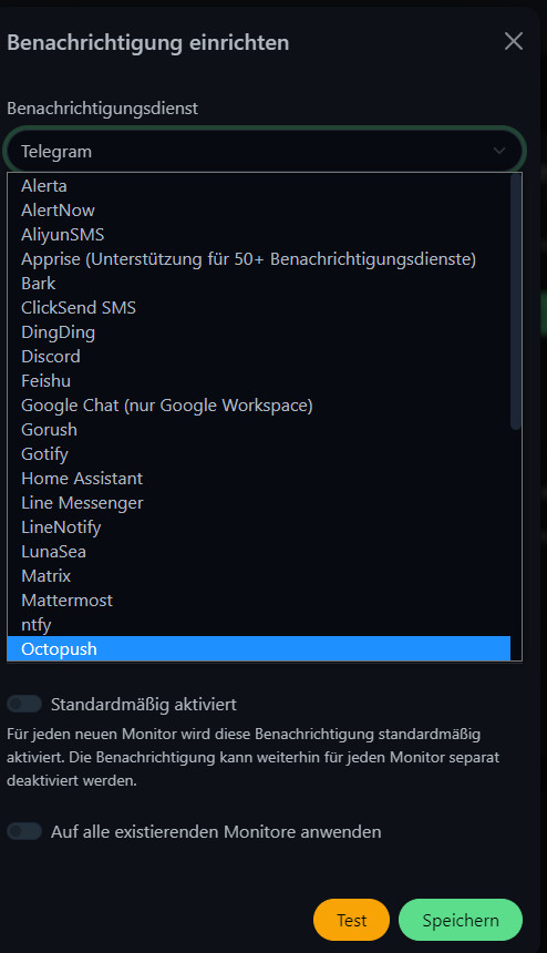 Mit Uptime Kuma ist es sehr schnell möglich eine einfache Überwachung für Geräte einzurichten und die Verfügbarkeit zu messen. Zudem bietet Uptime Kuma die Möglichkeit Benachrichtigungen über eine Vielzahl von Anbietern zu versenden.