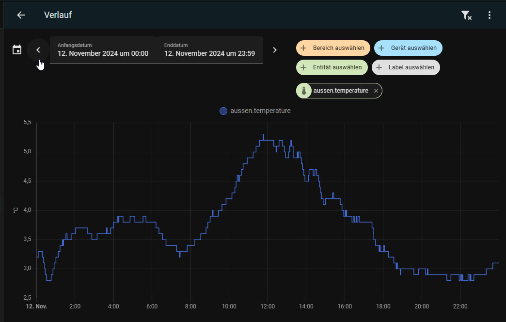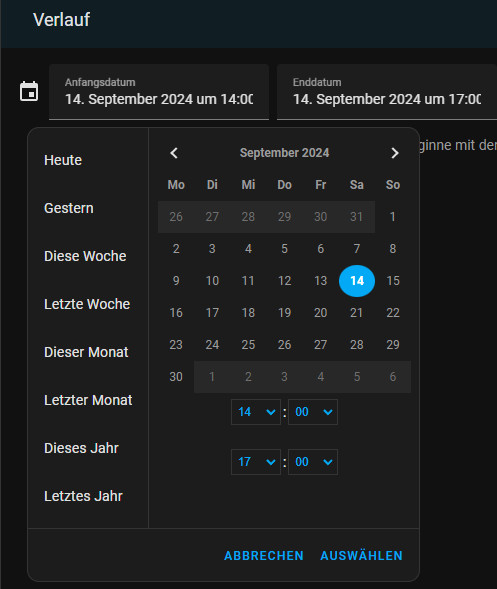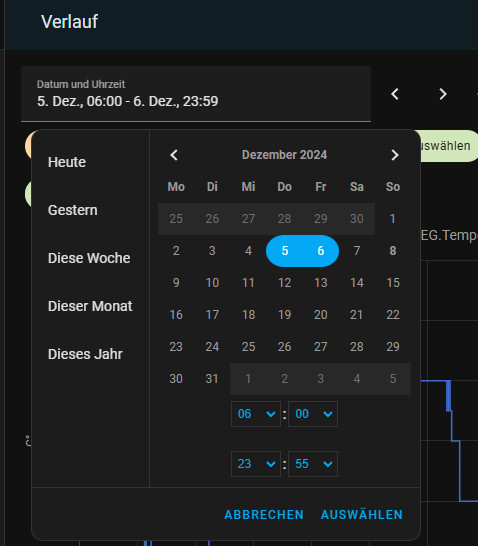 Dem Home Assistant Verlauf fehlte es bis zum 2024.12- Release an Zurück und Weiter Buttons. Die Auswahl der Zeitabschnitte konnte lediglich über den Kalender oder mithilfe bestimmter Zeitabschnitte erfolgen: "Heute", "Gestern", "Diese Woche", "Letzte Woche", "Dieser Monat", "Letzter Monat", "Dieses Jahr", "Letztes Jahr"