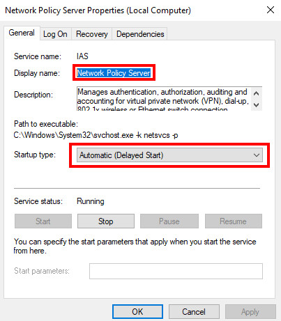 Lösung: Delayed Start für Routing and Remote Access entfernen und für den Network Policy Server hinzufügen (Für NPS sollte Startup type auf Automatic (Delayed Start) gestellt werden: