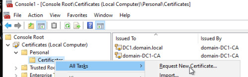 Auf Basis der zuvor erstellten Vorlage kann über die mmc.exe, Add Snap-In: Zertifikate: Computer: