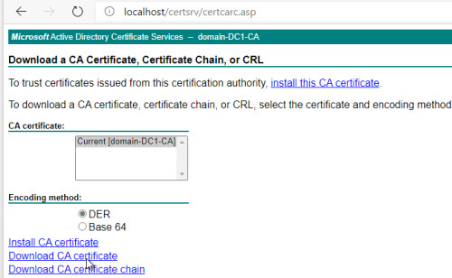 Clients, die in der Domäne sind, erhalten automatisch das für die Verbindung notwendige Root-Zertifikat. Für die Verbindung eines Clients ohne Domain-Mitgliedschaft kann das Root-Zertifikat exportiert und am Client eingespielt werden. Für den Export kann am einfachsten das Webservice der Zertifizierungsstelle verwendet werden: