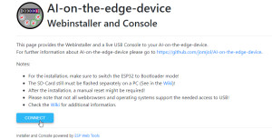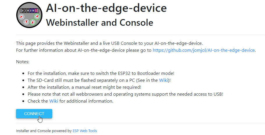 Wurde der ESP verkabelt, kann dieser per USB an den Computer angeschlossen und am einfachsten über den Web-Installer im Browser geflasht werden: https://jomjol.github.io/AI-on-the-edge-device/index.html