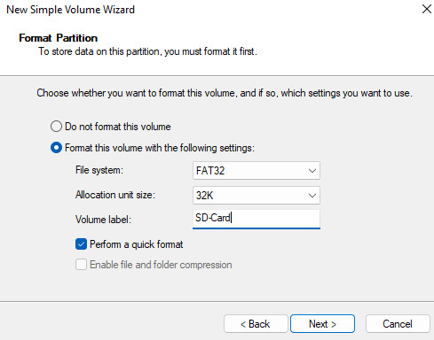 Nachdem das Projekt aufgespielt wurde, kann das Kabel zwischen Pin "IOo" und "GND" wieder entfernt werden. Jetzt fehlt uns noch die SD-Karte. Vorbereitend benötigt diese ein MBR-Layout und eine FAT32-Partition mit 32K als Zuordnungseinheit:
