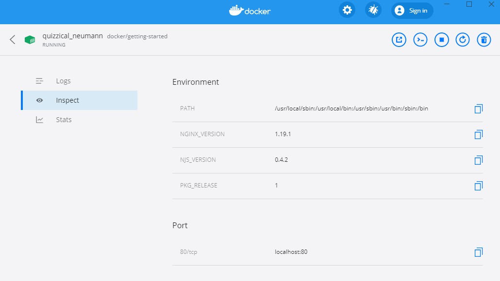 007264e9aaa1 docker/getting-started "/docker-entrypoint.…" 2 minutes ago Up About a minute 0.0.0.0:80->80/tcp quizzical_neumann