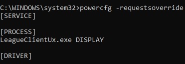 ausschalten mit: powercfg -requestsoverride PROCESS LeagueClientUx.exe DISPLAY SYSTEM AWAYMODE