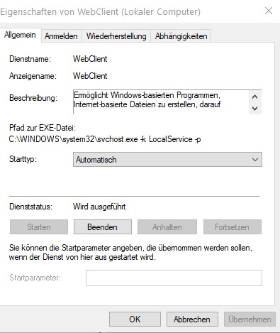 Der Befehl: "sc config webclient start=auto" stellt den Dienst auf automatisch,