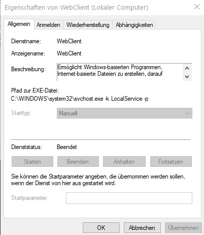 Die Ursache des Problems ist der nicht gestartete Dienst "Webclient".