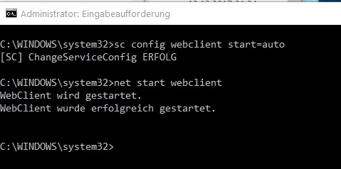 sc config webclient start=autosetzt den Dienststart auf automatisch.net start webclientstartet den Dienst.