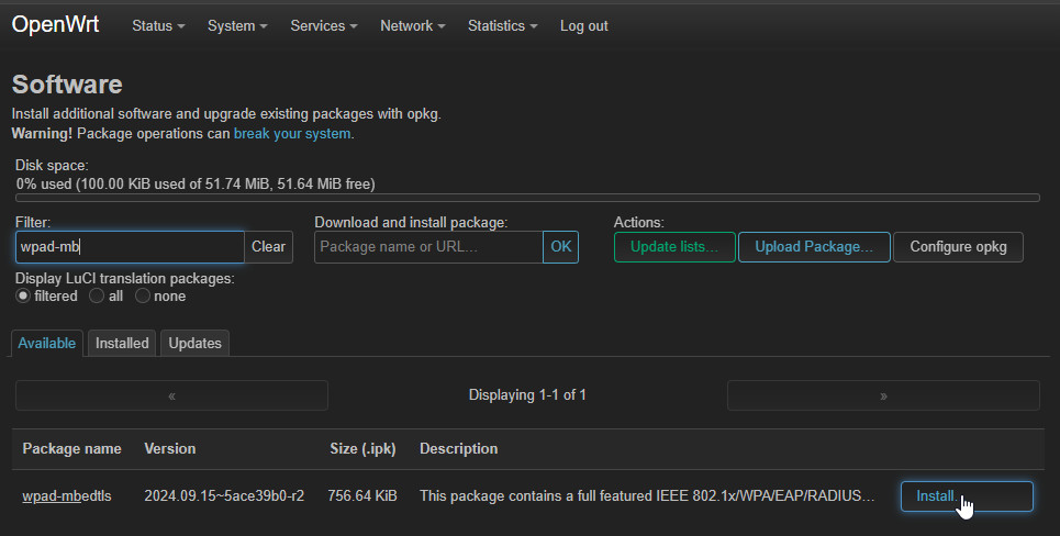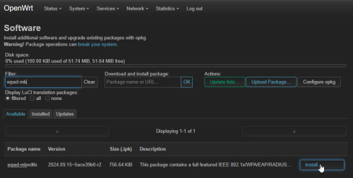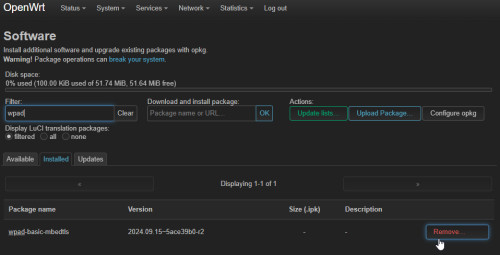 Damit OpenWrt alle WLAN-Funktionen verwenden kann, hatte ich lĂ€ngere Zeit wpad-basic-mbedtls mit der Vollversion: wpad-mbedtls ersetzt.Â