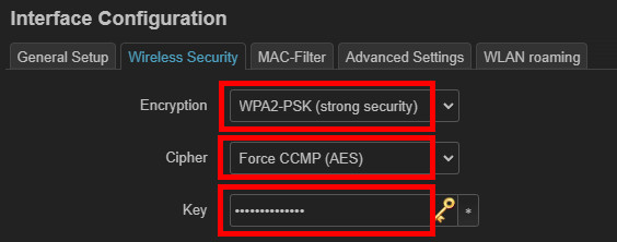 Bei meinem Setup verwende ich WPA2-PSK und AES als VerschlĂŒsselung. Die VerschlĂŒsselung auf "auto" machte bei bestimmten Clients Probleme.