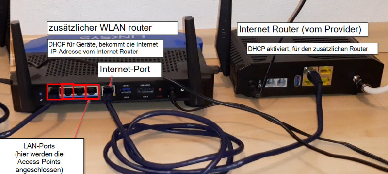 Die beiden Stockwerke meines Hauses sind durch eine Betondecke getrennt, wodurch es nicht möglich ist einen einzelnen WLAN-Access-Point so zu platzieren, dass dieser ĂŒberall ausreichend WLAN-Empfang zur VerfĂŒgung stellen kann. Nachdem der Router meines Providers nur begrenzte Möglichkeiten bietet, habe ich das WLAN darauf deaktiviert und verwende das GerĂ€t rein fĂŒr die Internetverbindung. Das WLAN im Erdgeschoss wird von einem zusĂ€tzlichen Router versorgt, diesen habe ich zentral im Erdgeschoss aufgestellt. Um den WLAN-Empfang im ersten Stock zu verbessern, habe ich dort einen weiteren Access-Point im Vorhaus platziert und zusĂ€tzlich einen Access Point im Wohnzimmer. Die Verbindung der GerĂ€te erfolgt ĂŒber eine LAN-Verkabelung, Ă€hnlich dem folgenden Versuchsaufbau: