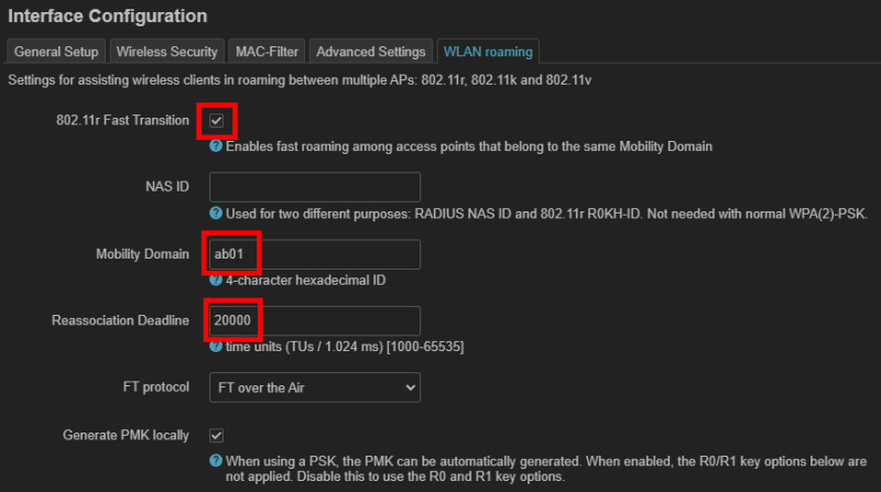 Falls nicht bereits geschehen, sollte in den WLAN-Einstellungen aller Interfaces mit demselben WLAN-Key 802.11r Fast Transition aktiviert werden: