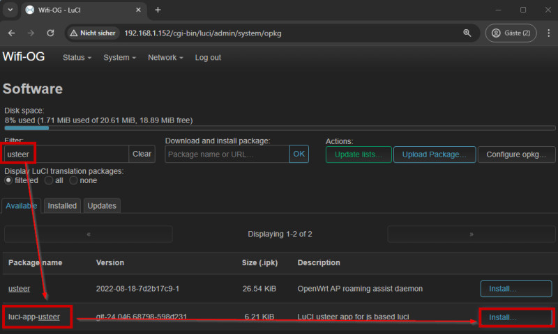 Ein Client Steering Deamon ist nicht zwingend notwendig, da WLAN-Clients in der Regel sehr gut selbst entscheiden, welcher Access Point gerade am besten geeignet ist. Wer dennoch auch ĂŒber die AccessPoints in das Verhalten eingreifen möchte, kann "usteer" per Terminal, oder ĂŒber die GUI als Software-Paket auf allen Access Points installieren: