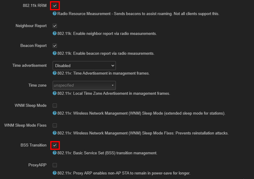Wie bereits im Artikel LAN & WLAN im Heimnetzwerk: der ultimative Guide beschrieben, reicht das Aktivieren der "802.11r Fast Transition" - Option aus, damit sich die GerĂ€te ohne Unterbrechung beim Wechsel von einer Empfangszone zur anderen verbinden. Die Verantwortung fĂŒr den Wechsel auf eine andere Empfangszone liegt dabei rein beim EndgerĂ€t. Damit die EndgerĂ€te mit zusĂ€tzlichen Informationen zum Netzwerk und zu möglichen AccessPoints versorgt werden, kann 802.11r und 802.11v aktiviert werden: