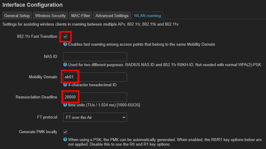 "FT over the Air" sollte anstelle von "FT over DS" verwendet werden, damit auch Apple-GerĂ€te ohne Probleme funktionieren. FĂŒr WPA2 und "FT over the Air" wird die Einstellung "Generate PMK locally" empfohlen. Alternativ kann "Generate PMK locally deaktiviert werden, wenn R0 und R1 Key Listen verwendet werden, siehe: OpenWrt: Externe R0 und R1 Key Holder erzeugen - online. Wer UCI-Befehle im Terminal bevorzugt, sollte einen Blick auf den Online-Helper werfen: OpenWRT WLAN FT-Konfiguration - Online generieren
