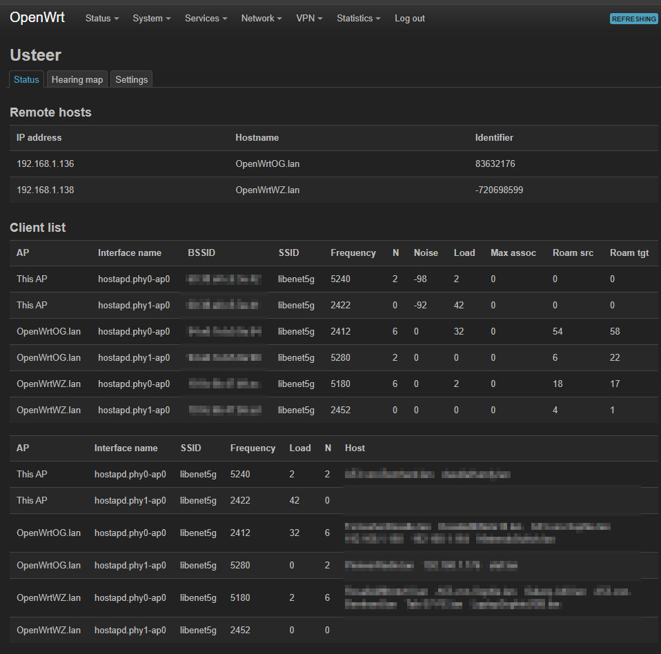 luci-app-usteer bietet einen Ăberblick in der GUI welche Clients sich gerade auf welchem Access Point verbunden haben, bez. ĂŒber die "Hearing map": Welcher Client auf welchem Access Point sichtbar ist. AuĂerdem zeigt die Client-List, ob alle Access Points fĂŒr einen WLAN-Empfang bereit sind: