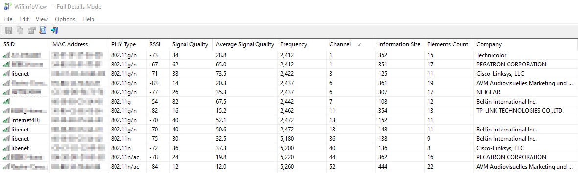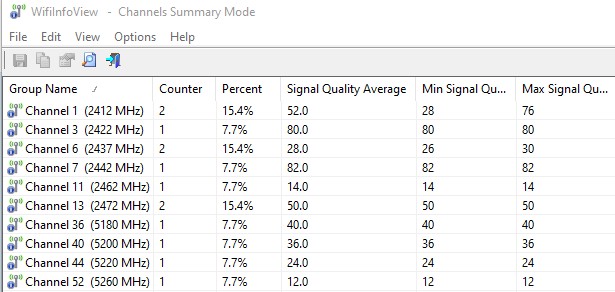 Eine Alternativ zur Eingabeaufforderung bietet das kleine Windows-Programm WifiInfoView von NirSoft. Das Tool kann ohne Installation gestartet werden und listet die verwendeten Kanäle und noch mehr Details zu den Geräten: