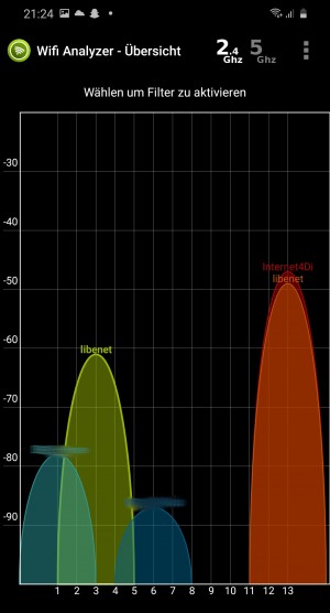 In dem Beispiel würde es Sinn machen, wenn der Besitzer des WLAN für das Netz: "Internet4Di" z.B. Kanal 9 oder 10 verwenden würde. Zudem können viele Router anstelle von 2,4Ghz auch 5Ghz für die Verbindung verwenden. Wenn die Endgeräte auch 5Ghz unterstützen, kann das die Geschwindigkeit und Stabilität steigern, allerdings hat ein 5Ghz-WLan meist eine geringere Reichweite.