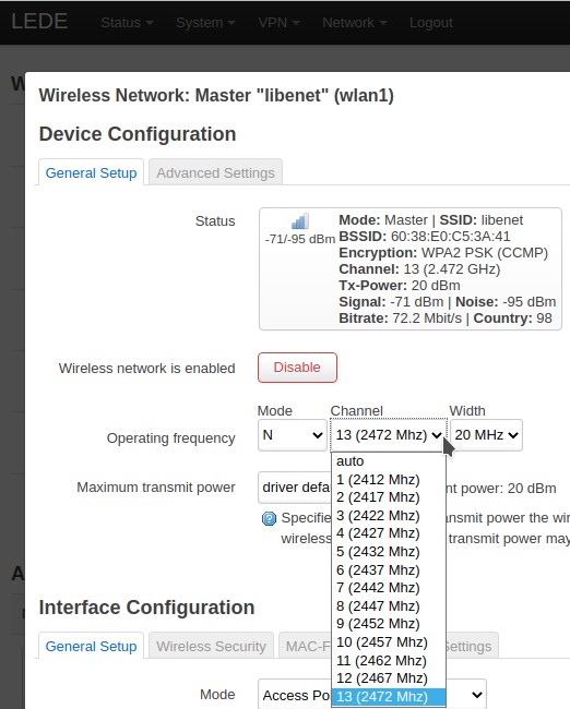 In den Einstellungen des Routers kann meist unter "Netzwerk", "WLAN" der Kanal des Wifi-Netzwerkes vorgegeben werden, hier am Beispiel von OpenWrt: (siehe auch: Alternative Router Firmware: OpenWrt)