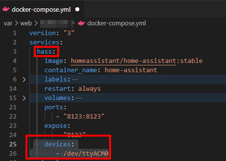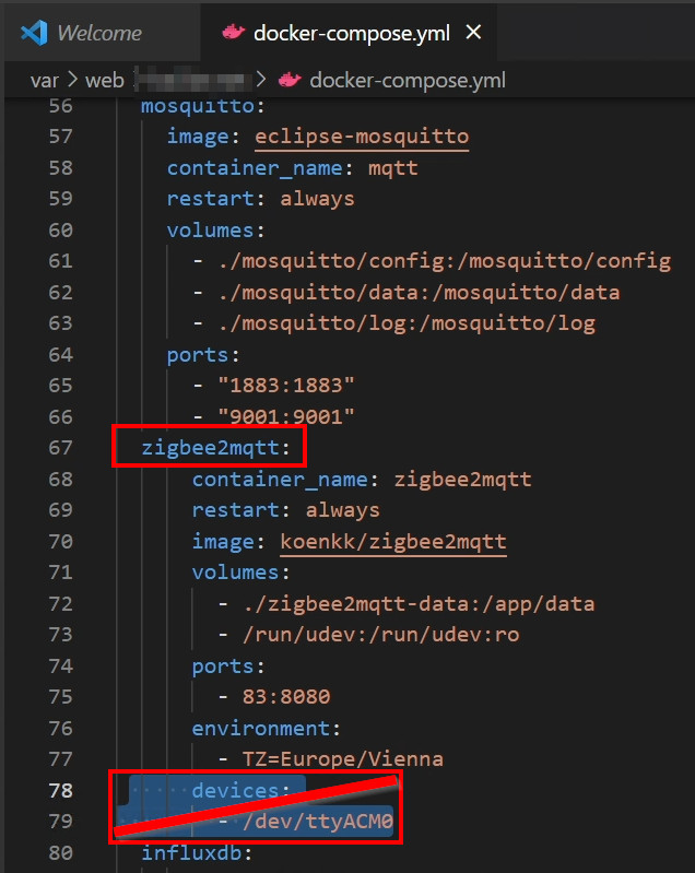 Der Container Zigbee2MQTT hat den Conbee-Stick über "devices" in den Container gemappt. Nachdem die Kommunikation mit dem ZigbeeCoordinator von Home Assistant mit ZHA direkt übernommen wird, kann das Device vom Container zigbee2mqtt entfernt und zum Home Assistant Container hinzugefügt werden: