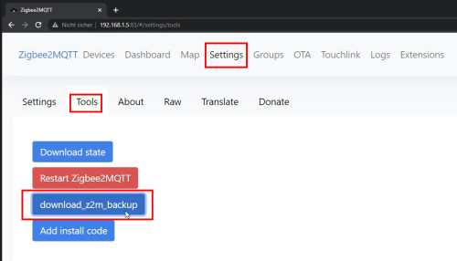 Als Erstes sollte für den Wechsel in Zigbee2MQTT ein Backup erstellt werden. An dieser Stelle musste ich feststellen, dass das Backup des Conbee II -Stick kein Coordinator-Backup enthält, siehe: www.zigbee2mqtt.io/guide/adapters/#notes. Beim Backup eines Zigbee-Coordinator mit einem Chip von Texas Instruments (CC2530/CC2531/CC2538/CC2652/CC1352) wird in der ZIP-Datei ein File mit dem Namen: coordinator_backup.json angelegt. Für den Conbee-Stick kann zwar auch ein Backup erstellt werden, eben aber ohne der coordinator_backup.json-Datei. Die Datei kann, oder in meinem Fall könnte, für einen Restore in Home Assistant verwendet werden. Zum Erstellen des Backups existiert in Zigbee2MQTT unter "Einstellungen", "Tools" der Button: "download_z2m_backup":