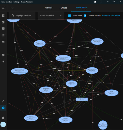 In Einstellungen / Integration kann mit Konfigurieren und Visualisieren das Zigbee-Netzwerk und dessen Verbindungen angezeigt werden.