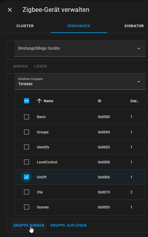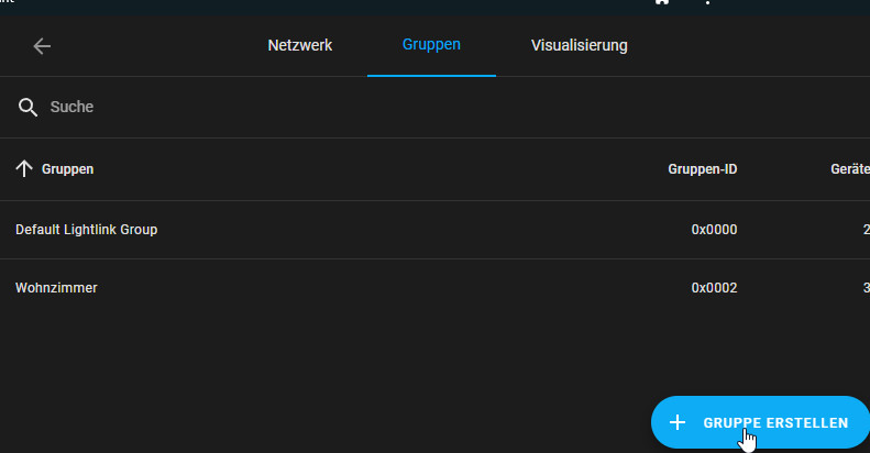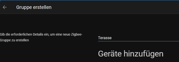 Damit die Zigbee-Geräte direkt von einem Schalter per Funk gesteuert werden können, gibt es die Möglichkeit diese direkt zu binden. Dazu habe ich zunächst eine Gruppe erstellt: